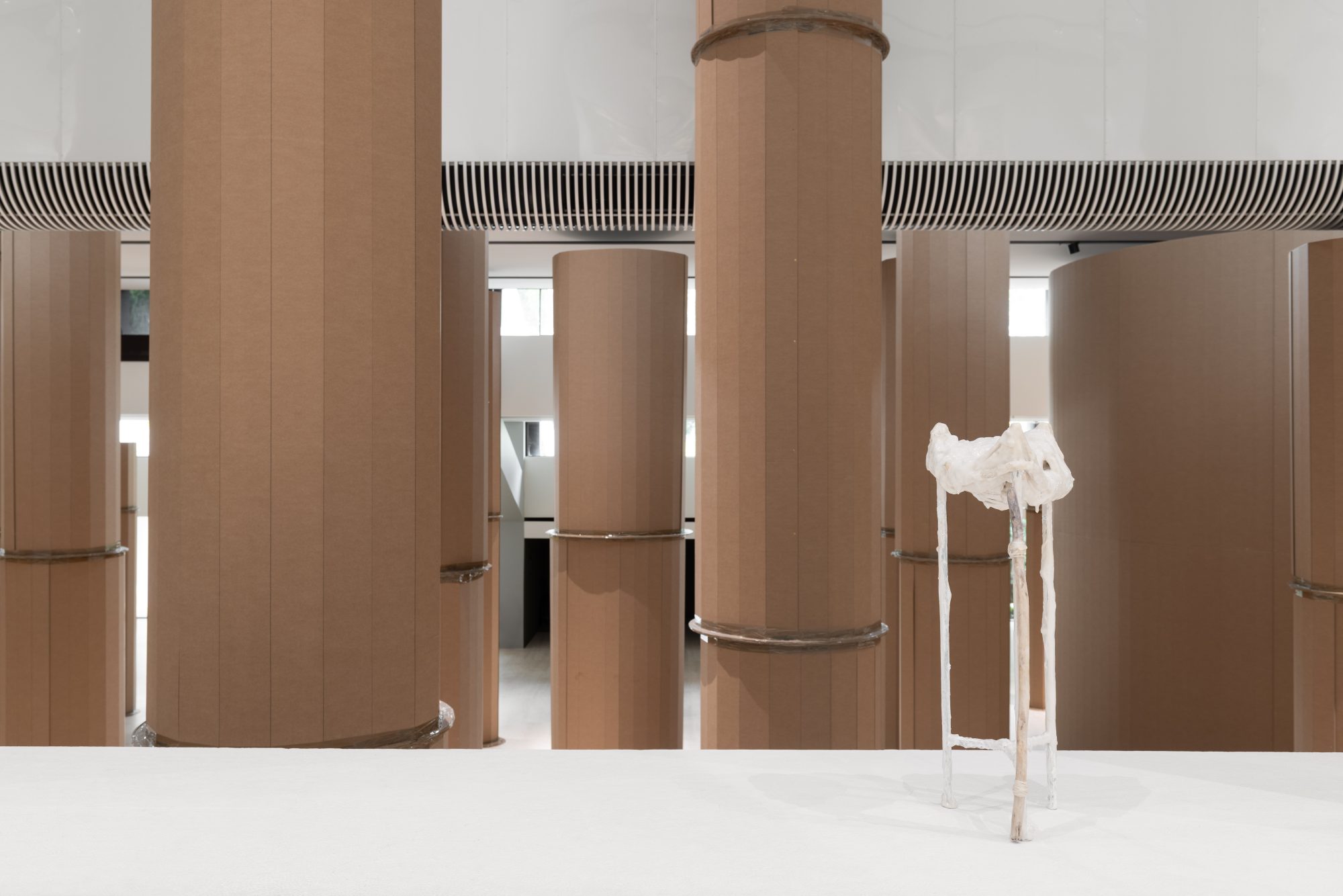 Carlos Bunga’s work is immediate, physically demanding, and responsive to its site, built from ordinary materials. For CAM’s Nave, he has engineered his largest installation yet, working from the outside in to join interior and exterior spaces. A terrain of cylindrical cardboard forms, taped into towering groupings, evokes both architectural columns and the soaring trunks of ancient trees. Arranged in shifting patterns, these structures create pathways and dead ends, giving the Nave a kinetic dimension that invites movement and encounter.